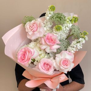 A dreamy hand-tied bouquet featuring pink roses, soft hydrangeas and white stocks, and translucent wrapping that whispers sophistication. Designed for those who appreciate artistic floral craftsmanship, this arrangement is a statement of elegance and emotion — ideal for heartfelt gifting or refined celebrations. Shop Rosewater Muse — a luxury bouquet of chrysanthemums and carnations. Enjoy online flower delivery in the UAE with same-day service in Abu Dhabi and next-day across Dubai, Sharjah, and Al Ain.