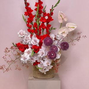Rouge Sonata is a striking floral arrangement featuring red gladiolus, white roses, pink anthuriums, and purple Chrysanthemums — artfully composed in a woven basket. This luxury bouquet is perfect for weddings, events, or upscale gifting. Enjoy same-day delivery in Abu Dhabi and next-day across Dubai, Sharjah, and Al Ain. Buy flowers online and elevate every moment with premium artistry.