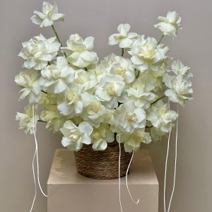Soft, serene, and timeless — Serenity Threads is a handcrafted arrangement of white roses in a woven basket, accented with cascading ribbons. Ideal for minimalist interiors, weddings, or thoughtful gifts, this luxury flower arrangement blends elegance with artistic flair. Buy flowers online and enjoy same-day delivery in Abu Dhabi, next-day across Dubai, Sharjah, and Al Ain.