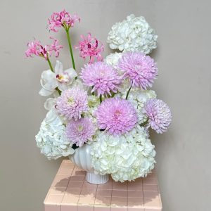 Serenity Vase is a serene blend of white hydrangeas, orchids, nerine lilies, and chrysanthemums in a ceramic vessel. This luxury flower arrangement suits refined interiors, weddings, and elegant gifting. Available for online flower delivery UAE, with same-day service in Abu Dhabi and next-day across Dubai, Sharjah, and Al Ain.