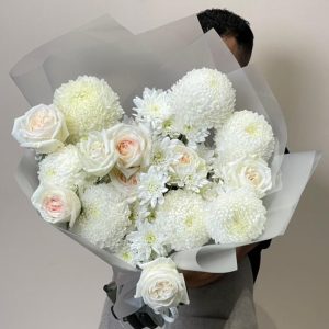 A timeless expression of purity and grace, Snowdrop Elegance features white roses with blush centers and delicate chrysanthemums. Wrapped in translucent white paper, this bouquet is ideal for weddings, anniversaries, or elegant home styling. Designed for high-end clientele seeking luxury flower arrangements. Experience luxury flower arrangements with same-day delivery in Abu Dhabi and next-day across the UAE. Buy flowers online with ease and style.