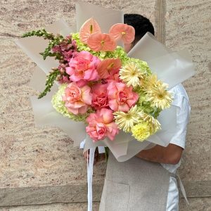 A luminous bouquet of pink roses, peach anthuriums, yellow gerberas, and green hydrangeas—wrapped in sheer white paper and tied with Espoir ribbons. This luxury flower arrangement evokes warmth and elegance, perfect for gifting or home decor. Available for same-day delivery in Abu Dhabi and next-day across the UAE—including Dubai, Sharjah, and Al Ain. Buy flowers online and experience premium floral artistry.