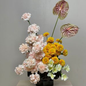 Tropic Noir is a bold and expressive floral arrangement that blends texture and color with finesse. Featuring ruffled pink carnations, vibrant yellow marigold Chrysanthemums, exotic pink-green anthuriums, this bouquet is housed in a sleek black vase for dramatic contrast. Perfect for modern interiors, corporate gifting, or statement decor. Experience luxury flower arrangements with same-day delivery in Abu Dhabi and next-day across Dubai, Sharjah, and Al Ain. Buy flowers online and let your space bloom with personality.