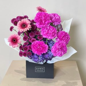 Velour Éclat is a radiant celebration of femininity and flair. Nestled in our signature black box, this luxury flower arrangement blends pink carnations, gerbera daisies, hydrangeas, and chrysanthemums — each bloom chosen for its vibrancy and texture. Wrapped in crisp white paper for contrast, it’s a statement piece for weddings, events, or elegant gifting. Available for same-day delivery in Abu Dhabi and next-day across Dubai, Sharjah, and Al Ain.