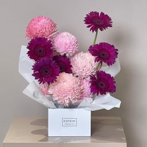 Discover the Velvet Petal — a curated blend of pink Chrysanthemums and deep plum gerberas, presented in Espoir's signature white box. This luxury flower arrangement is perfect for birthdays, celebrations, and heartfelt gestures. Available for online flower delivery UAE-wide, with same-day service in Abu Dhabi and next-day delivery to Dubai, Sharjah, and Al Ain.