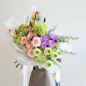 Verdant Grace is a lush, hand-tied bouquet that celebrates nature’s elegance. Featuring green hydrangeas, blush pink roses, green chrysanthemums, and exotic orchids with red accents, this arrangement is wrapped in crisp white paper and finished with a satin ribbon—perfect for upscale gifting or event styling. Designed for those who seek luxury flower arrangements with a touch of botanical artistry, Verdant Grace is available for same-day delivery in Abu Dhabi and next-day delivery across the UAE, including Dubai, Sharjah, and Al Ain.