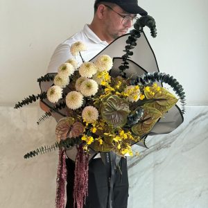 A bold expression of texture and tone, Verdant Reverie combines white pompom blooms, foliage, maroon hanging Amaranthus, and reddish tropical Anthuriums in a striking bouquet. Wrapped in sheer black paper, this luxury flower arrangement is ideal for artistic gifting, modern weddings, or upscale interiors. Available for same-day delivery in Abu Dhabi and next-day across Dubai, Sharjah, Al Ain, and the UAE. Buy flowers online and indulge in botanical drama.