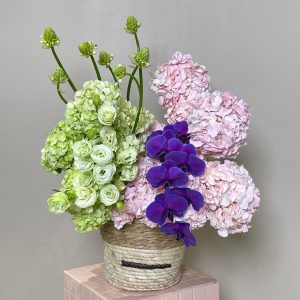 Verdant Reverie is a luxurious floral arrangement featuring light green lisianthus, soft pink hydrangeas, and cascading deep purple orchids. Nestled in a handwoven basket, this bouquet evokes elegance and artistry—perfect for weddings, upscale events, or refined home decor. Available for same-day delivery in Abu Dhabi and next-day across Dubai, Sharjah, and Al Ain. Buy flowers online and experience premium floral craftsmanship.