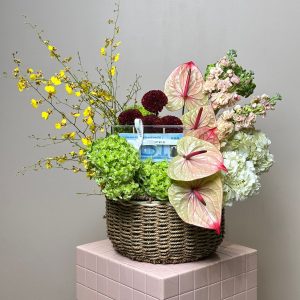 A poetic celebration of botanical diversity, Verdant Verse features a curated blend of light green and white hydrangeas, pink-veined anthuriums, yellow forsythia branches, and deep red pompom blooms. Nestled in a handwoven basket, this arrangement evokes rustic elegance with a contemporary twist. Ideal for luxury home styling, seasonal gifting, or artistic event décor. Each stem is selected for freshness and visual impact, ensuring a lasting impression. Enjoy same-day delivery in Abu Dhabi and next-day across the UAE — including Dubai, Sharjah, and Al Ain. Buy flowers online and elevate your space with natural sophistication.