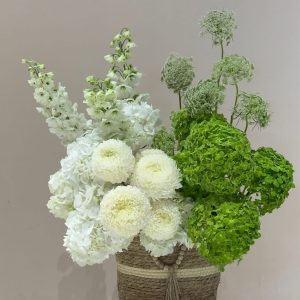Verdant Whisper is a serene basket of white chrysanthemums, hydrangeas, and Queen Anne’s lace, accented with green tones and rustic tassel detail. This luxury flower arrangement evokes tranquility and charm, perfect for gifting or refined home styling. Enjoy online flower delivery UAE-wide, with same-day service in Abu Dhabi and next-day across Dubai, Sharjah, and Al Ain.