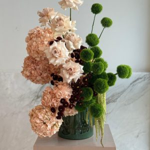 Elevate your space with Verdigris Poem, a luxury flower arrangement that blends pale peach roses, cascading blush hydrangeas, maroon chrysanthemums, and vibrant green pom-poms in a sculptural green ceramic vase. Designed for discerning tastes, this asymmetrical composition evokes artistic elegance and modern refinement. Ideal for weddings, upscale events, or statement home decor, it’s a celebration of texture, contrast, and floral artistry. Enjoy same-day delivery in Abu Dhabi and next-day across the UAE — including Dubai, Sharjah, and Al Ain. Buy flowers online with confidence and style.