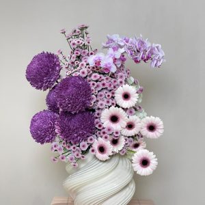 Immerse yourself in the poetic elegance of Violet Muse — a sculptural floral arrangement that blends the drama of deep purple chrysanthemums with the softness of lavender orchids and blush-toned gerberas. Presented in a uniquely contoured white ceramic vase, this bouquet is a testament to artistic floral design and refined taste. Ideal for weddings, upscale events, or as a statement gift, it evokes sophistication and serenity in every petal. Whether you're seeking online flower delivery in the UAE or curating luxury flower arrangements for your home, Orchid Reverie offers premium quality and timeless beauty. Enjoy same-day delivery in Abu Dhabi and next-day across Dubai, Sharjah, and Al Ain.