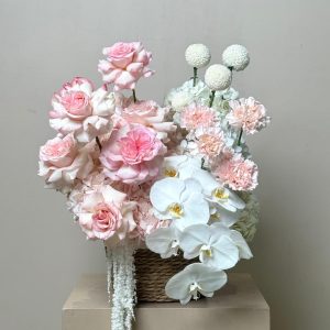 Woven Whimsy blends soft pink roses, white orchids, pale carnations, and cascading amaranthus in a handwoven basket. This luxury flower arrangement is ideal for elegant home décor, heartfelt gifting, or event styling. Crafted with premium blooms and artistic flair, it’s available for same-day delivery in Abu Dhabi and next-day across Dubai, Sharjah, and Al Ain.