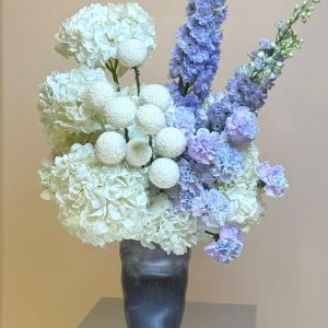 The Lavender Breeze is a serene blend of white hydrangeas, snowball chrysanthemums, lavender carnations, and tall delphinium stems — a composition that feels like a breath of fresh air. Designed in a dark marbled vase, this arrangement brings depth, contrast, and refined elegance to any setting. Perfect for corporate gifting, luxury home décor, weddings, and thoughtful celebrations, this arrangement offers a modern interpretation of garden‑inspired beauty. Each stem is selected for its premium quality, ensuring long‑lasting freshness and visual harmony. Experience seamless online flower delivery UAE, with same‑day delivery in Abu Dhabi and next‑day delivery to Dubai, Sharjah, and Al Ain.