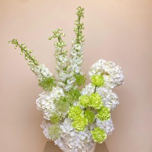 Fresh, clean, and undeniably chic, the White Velvet arrangement brings a garden-fresh feel to the world of luxury flower arrangements. Massive white hydrangea clouds provide a soft base for the dancing stems of white delphinium and the vibrant, ruffled texture of lime-green carnations. This arrangement is a favorite for weddings, bridal showers, and refreshing home interiors. As a leader in online flower delivery UAE, we ensure that every petal arrives in pristine condition, maintaining its artistic integrity from our studio to your door.