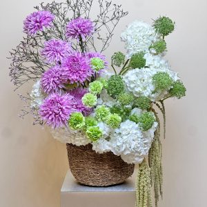 The Serene Meadow Basket is a refined expression of natural elegance, blending soft white hydrangeas, fresh green carnations, sculptural green allium‑style blooms, and lavender chrysanthemums in a beautifully woven basket. This arrangement brings together texture, colour, and balance. Perfect for luxury home styling, corporate gifting, wellness spaces, and sophisticated celebrations. Crafted with premium stems and arranged with artistic precision, this design embodies the beauty of modern floral minimalism. Its airy branches add height and movement, creating a serene, gallery‑worthy composition. We offer same‑day delivery in Abu Dhabi and next‑day across the UAE including Dubai, Sharjah, and Al Ain, making it effortless to buy flowers online for any occasion.