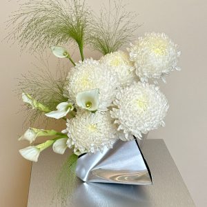 A sophisticated Eid floral statement blending purity, texture, and contemporary design. White Serenity showcases lush white chrysanthemums, sculptural calla lilies, and airy greenery presented in metallic silver vase for a refined, modern finish. Ideal for luxury homes, Eid gifting, weddings, and event décor. Available with online flower delivery UAE, including same‑day delivery in Abu Dhabi and next‑day across Dubai, Sharjah, and Al Ain. A perfect choice for customers seeking luxury flower arrangements and seamless buy flowers online service.